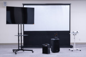プロジェクターやマイク、ホワイトボードなど、会議や研修に必要な備品がすでに揃っているためPCの持参のみでOK。この機会にお試しいただきやすい価格でご用意します。